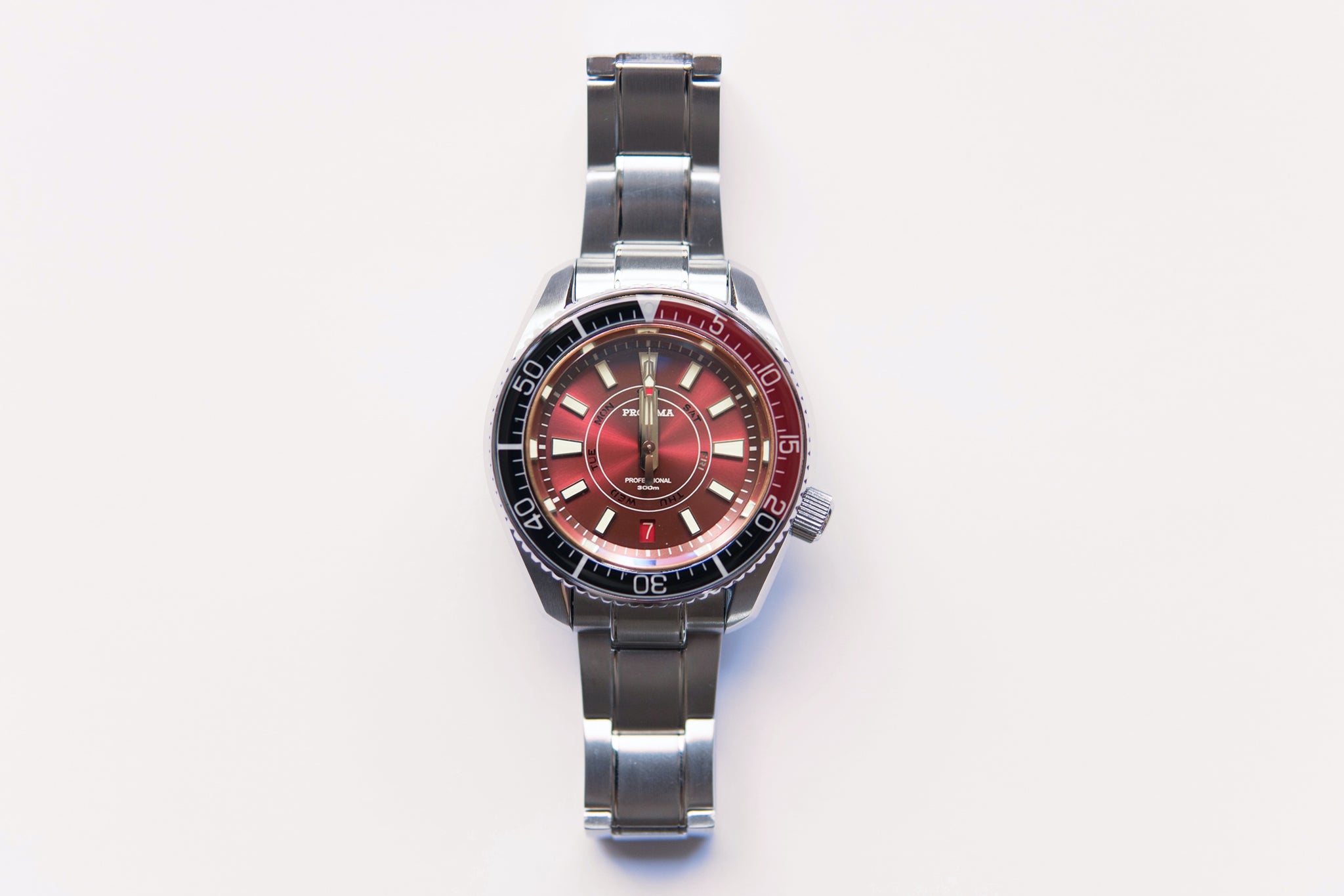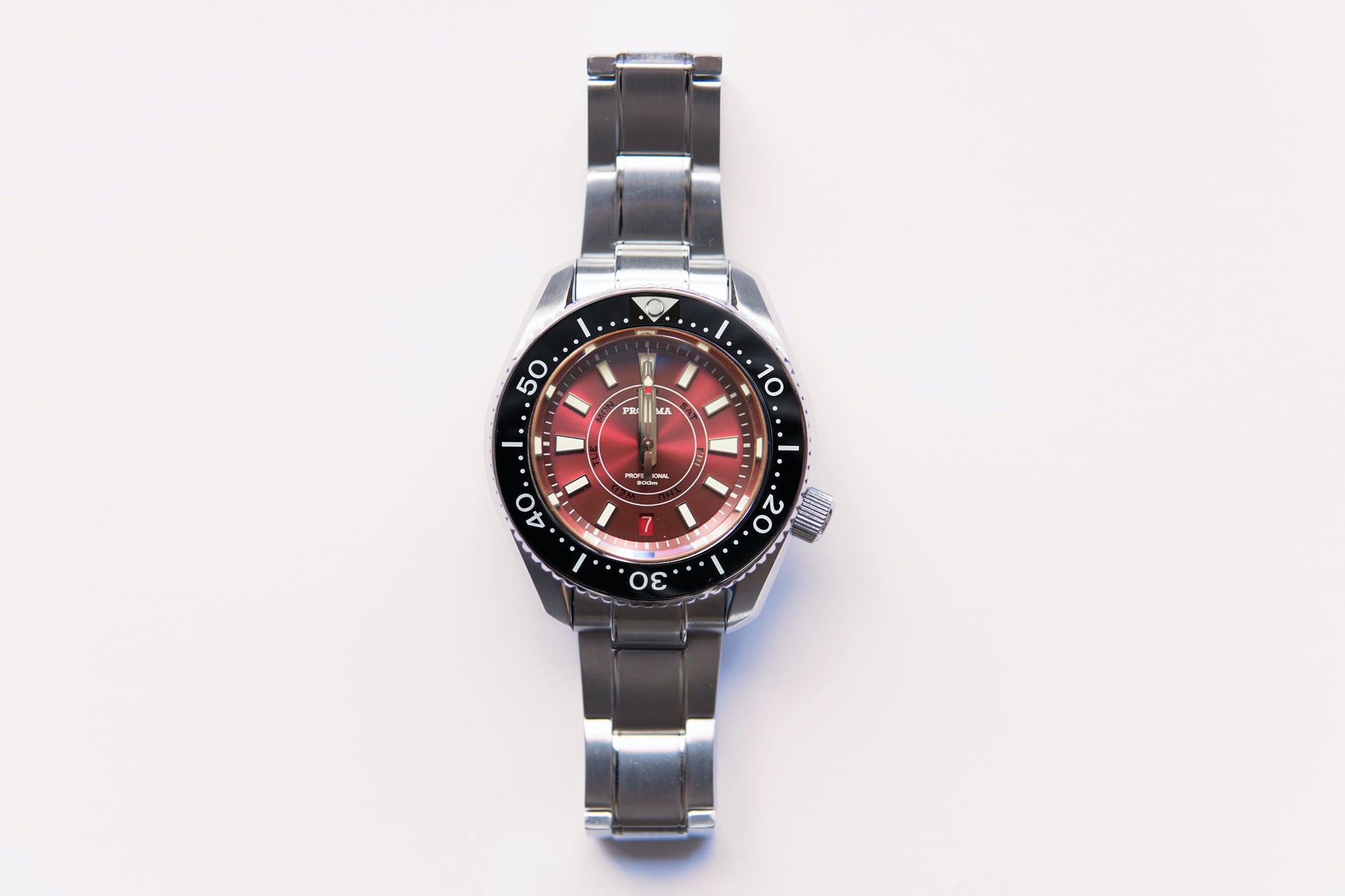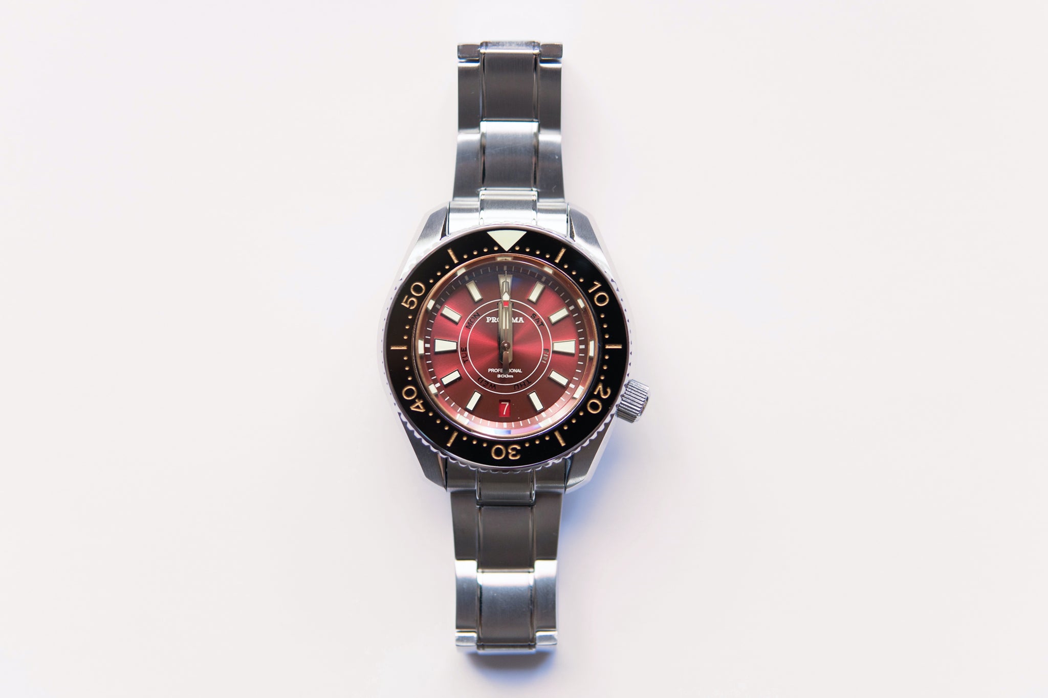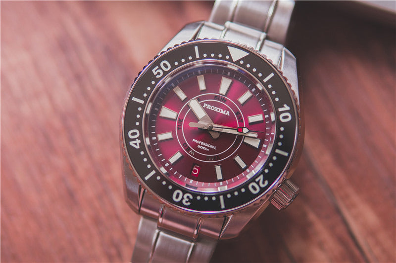 The Proxima MM300 Day Date is a stunning watch with a unique red velvet dial with lumed date and day disc. I am thoroughly impressed with the quality of the watch at this price point under $300 dollars.